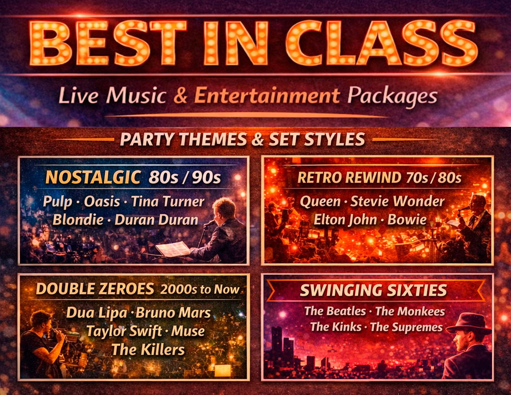 Filling dance floors across the South West and beyond, Best In Class are a professional party band delivering high-energy performances of your favourite Soul, Pop and Motown, complete with punchy brass lines, alongside Indie and Rock with raunchy guitar licks. Spanning the 60s through to the present day, they also offer dedicated themed nights — from 60s, 70s, 80s, 90s to 2000s — covering artists such as Lizzo, Bowie, Stevie Wonder, The Weeknd, The Cure, Stereophonics, The Beatles and much more.