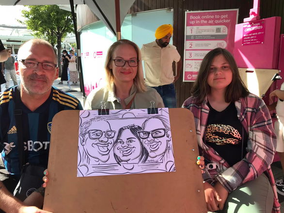 Working with paper sizes from A4 to A3 and beyond, he offers quick-fire singles, fun couples, and large-scale group drawings that become a lasting memento of your celebration. His work doesn’t just entertain—it gathers crowds, sparks conversation, and adds a unique artistic touch that guests won’t forget.