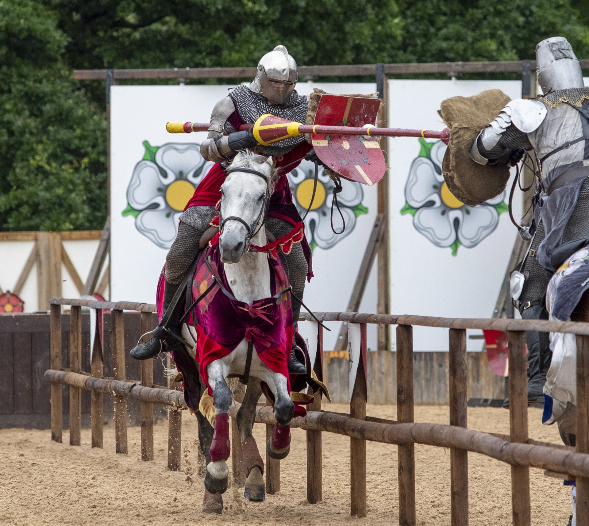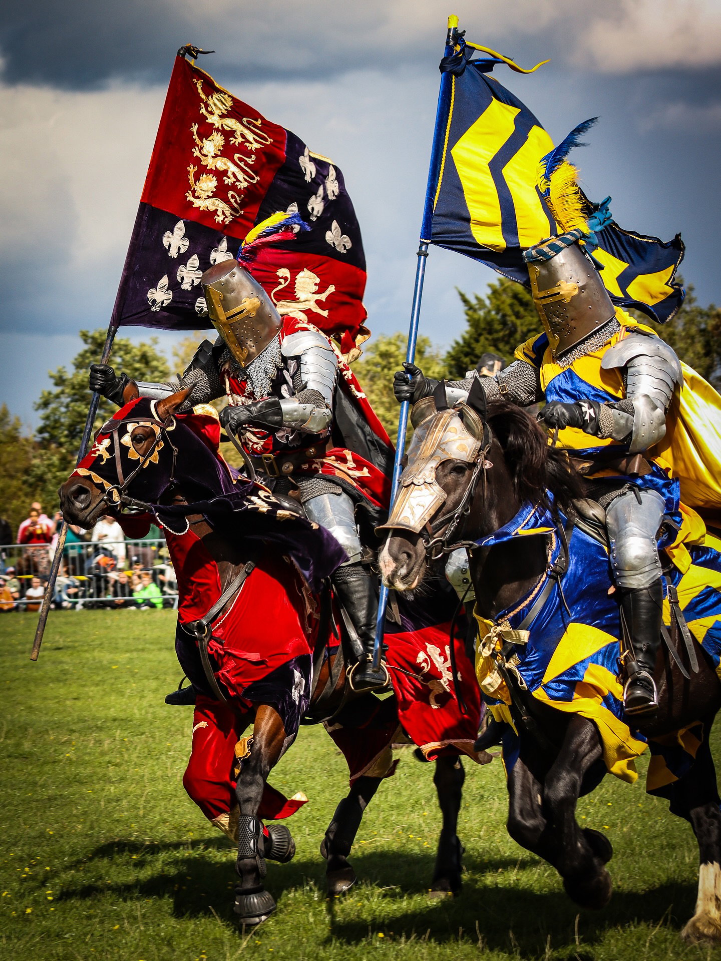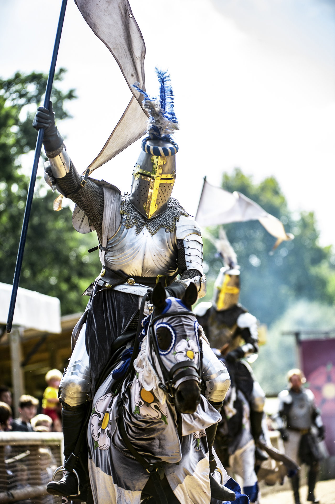 The spectacle begins as two gallant Knights and their magnificent horses enter the arena in full armour and heraldry. Banners fly, the atmosphere builds, and the challenge is laid down as the rivals prepare to meet in combat.