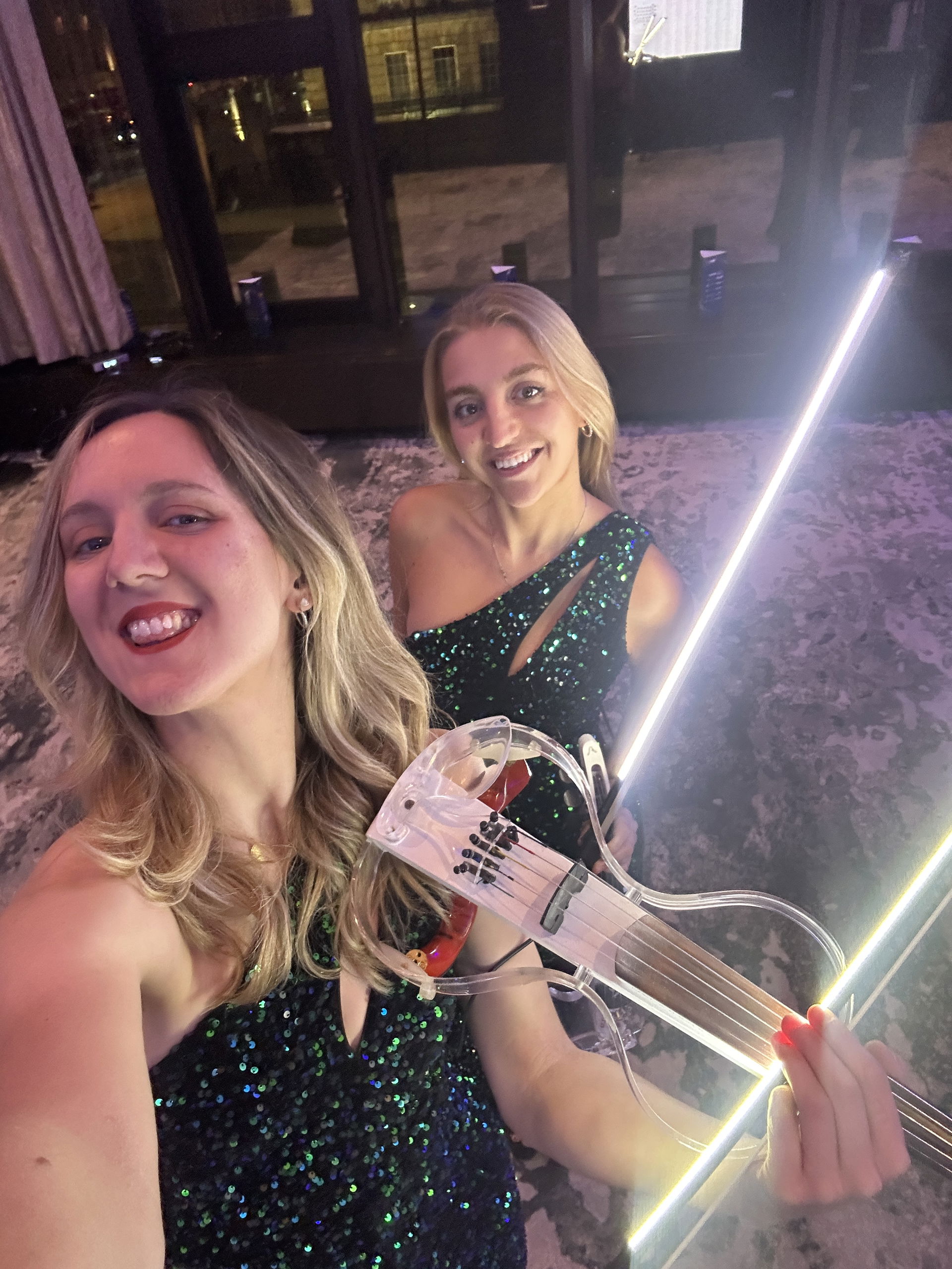 “These two very talented violinists performed two fantastic 35 minute sets at my daughter’s wedding breakfast and they were amazing. First set relaxing traditional and modern classics and then a costume change and a switch to electric violins for a more upbeat sound equally appreciated for quality of sound and entertainment.”