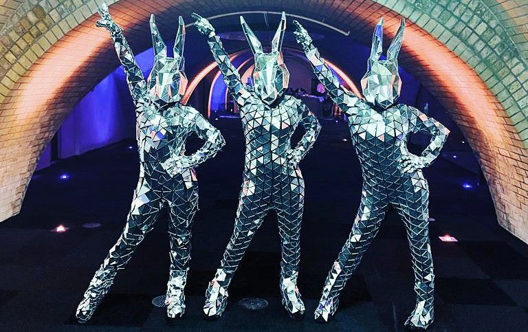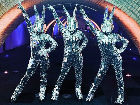 The dazziling Robo Bunny costume is made from over 1,000 small diamond shaped mirrors from bunny ear to toe! Shining lights reflect off this beautifully made costume making the Robo Bunny Dazzle throughout the evening.