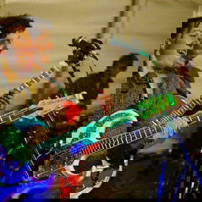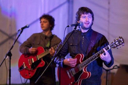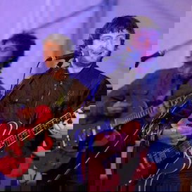 The bands red Gibson guitars reinforce the bands traditional 'rock'n'roll' style.